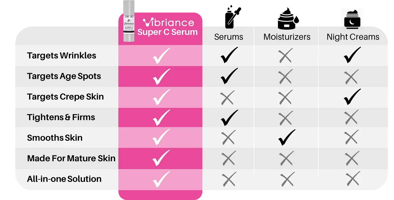 Vibriance Super C Serum is an all-in-one moisturizing serum that contains safe & effective cosmeceutical grade active ingredients designed to give you long term results. It's formulated to reduce the appearance of wrinkles and age spots and leave your skin with a youthful glow.